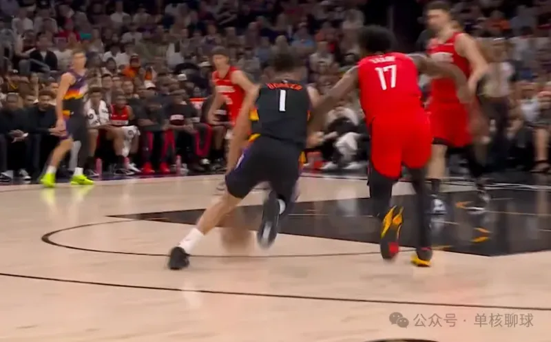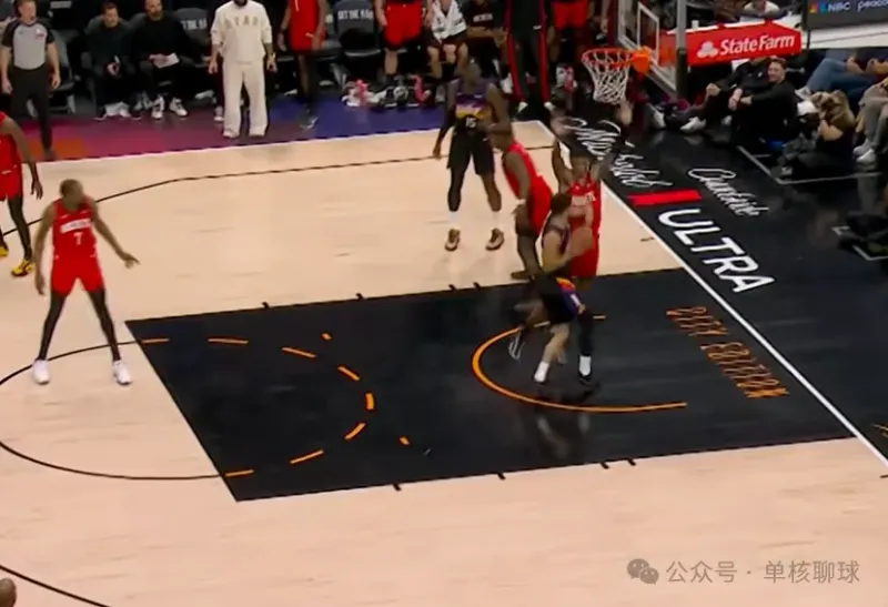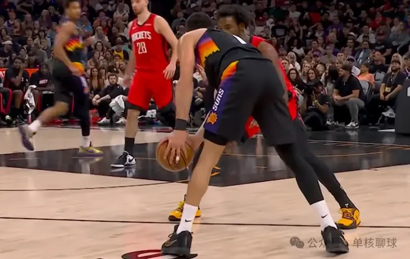 泰特登场后,完美替代了芬尼史密斯的功能性角色,火箭也随之启用理想中的无限换防策略,贴合五锋阵容的防守设想。但小贾巴里・史密斯面对布克时,始终无法完成有效限制,成为太阳针对的防守突破口。