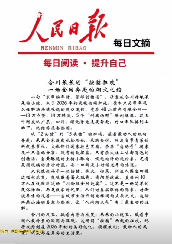 网友创作的二创视频、表情包、段子满天飞,有人甚至编了顺口溜:“2026第一火,合川呆呆杀年猪;城里人都往村里跑,就为一口刨猪汤。”