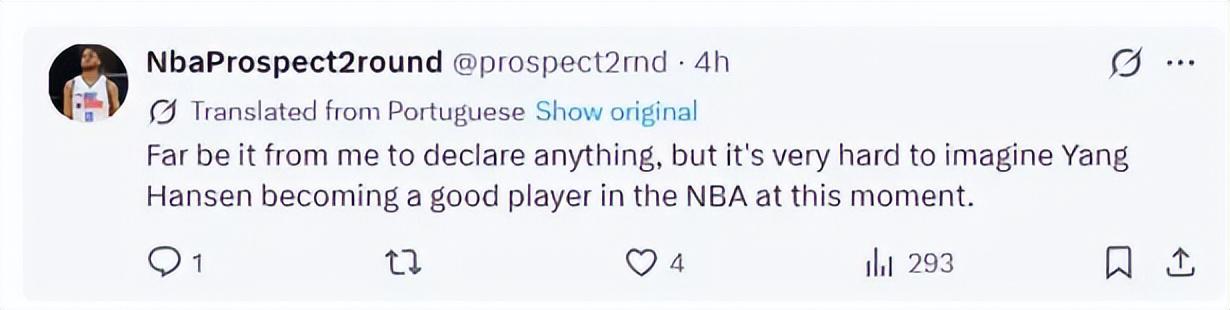“我不想说太多,但现在真的很难想象杨瀚森未来会成为一名优秀的NBA球员。”